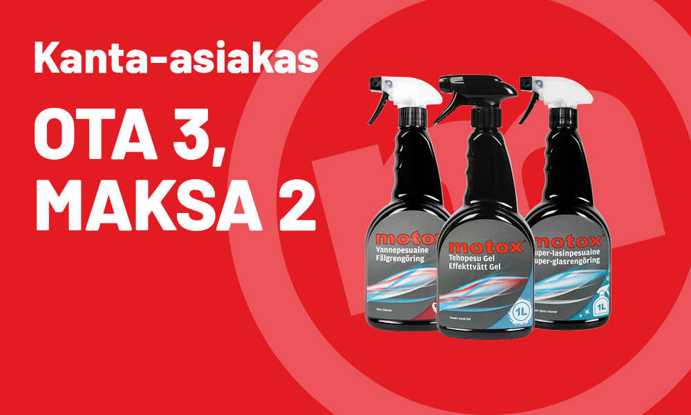 Ota kolme, maksa kaksi! Kun ostat Motoxin vannepesuaineen, lasinpesuaineen sekä tehopesuaineen, tarjoamme edullisimman ilmaiseksi!