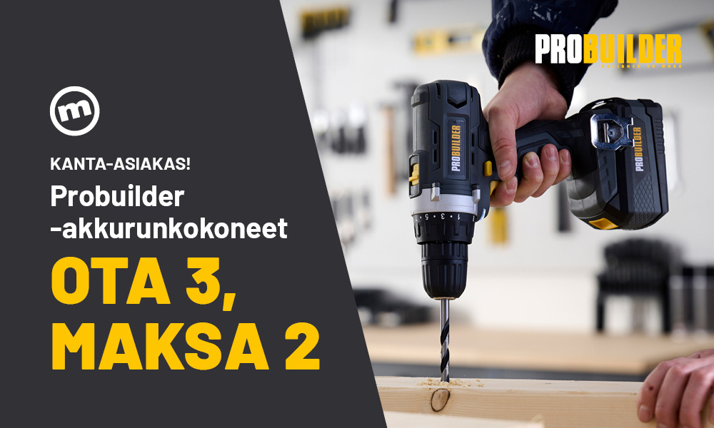 Kanta-asiakas! Probuilder - Ota kolme, maksa kaksi. Probuilder on täydellinen valinta kaikille kotinikkarille, jotka arvostavat monipuolisuutta ja helppokäyttöisyyttä. Sarjan sähkö- ja akkutyökaluista löytyy kättä pidempää niin kodin pieniin korjaustöihin kuin suurempiinkin projekteihin. Nyt voit vieläpä valita tarpeisiisi runkokoneiden joukosta kolme suosikkia, joista maksat vain kahdesta. Tarjoamme edullisimman!