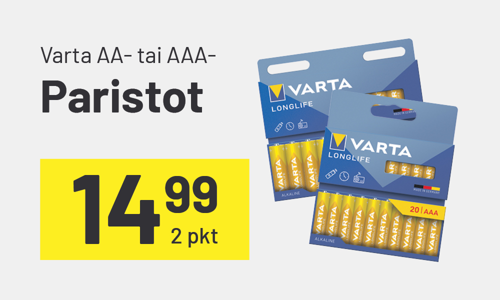 Kun ostat kaksi Varta Longlife AA- tai AAA -paristopakkausta, saat ne huippuedulliseen etuhintaan 14,90 € (Norm. 19,98). Yhdessä pakkauksessa paristoja on 20 kpl, joten tarjoushintaan saat paristoja 40 kpl! Kampanjassa olevat paristopakkaukset näet tällä sivulla. Kampanja on voimassa 15.10. - 23.12.2025.