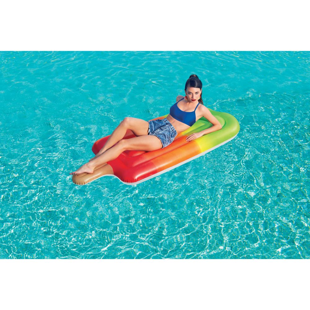 Bestwayn pirteän raidallinen jäätelötikku-uimapatja. Uimapatja on 185 x 89 cm ja se kestää enintään 90 kg. Mehujää-uimapatjan voi ottaa mukaan rannalle ja luonnonvesistöihin tai suurempiin uima-altaisiin. Patja on tarkoitettu yhdelle hengelle. Uimapatja on ilmalla täytettävä, ja se kannattaa tehdä esim. Bestwayn ilmapumpulla. Pakkauksessa on mukana korjauspaikka. Muista aina valvoa huolellisesti veden äärellä leikkiviä lapsia.