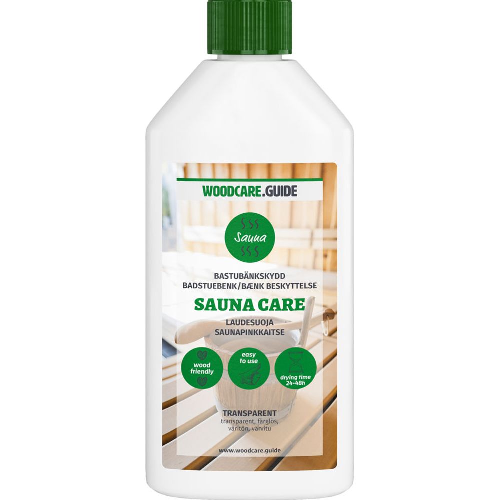Woodcare.Guide Sauna Care laudesuoja suojaa saunan lauteet lialta ja pitää pinnat puhtaina ja hygieenisinä. Helposti levitettävä laudesuoja-aine ei muodosta lauteille kuumaa pintakalvoa, se ei ole tulenarka, eikä terveydelle vaarallinen. Uudet lauteet suositellaan käsiteltäväksi ennen käyttöä ja jatkossa 1-2 kertaa vuodessa aina siivouksen yhteydessä. Laudesuoja on väritöntä, mutta se syventää puupintojen luonnollista sävyä. Kokeile laudesuojaa ensin pienelle alueelle, että lopputulos vastaa odotuksiasi.