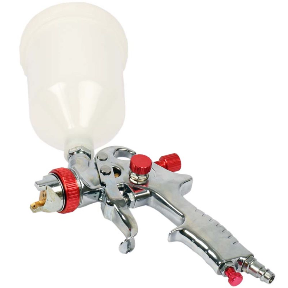 Maaliruisku yläpuolisella 0,6 litran muovisäiliöllä. Suuttimen koko 1,4 mm.